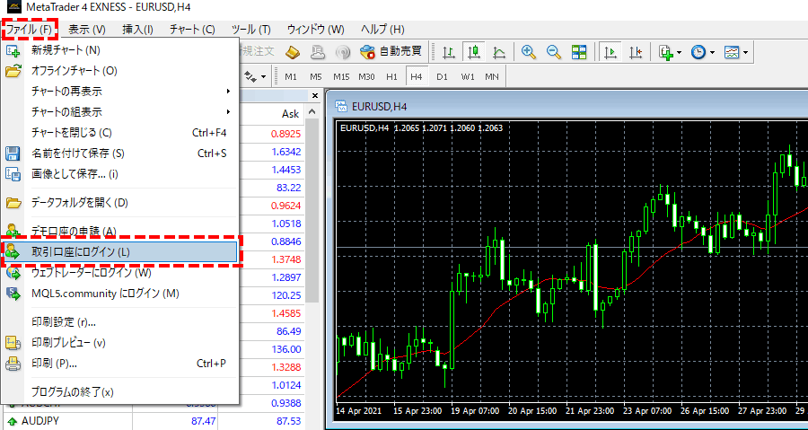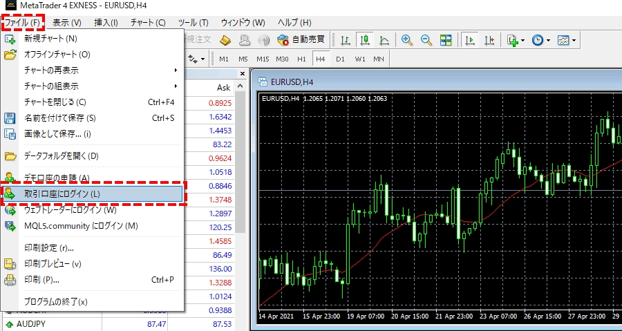 画面左上にある「ファイル (F)」をクリックして、「取引口座にログイン (L)」をクリックします。